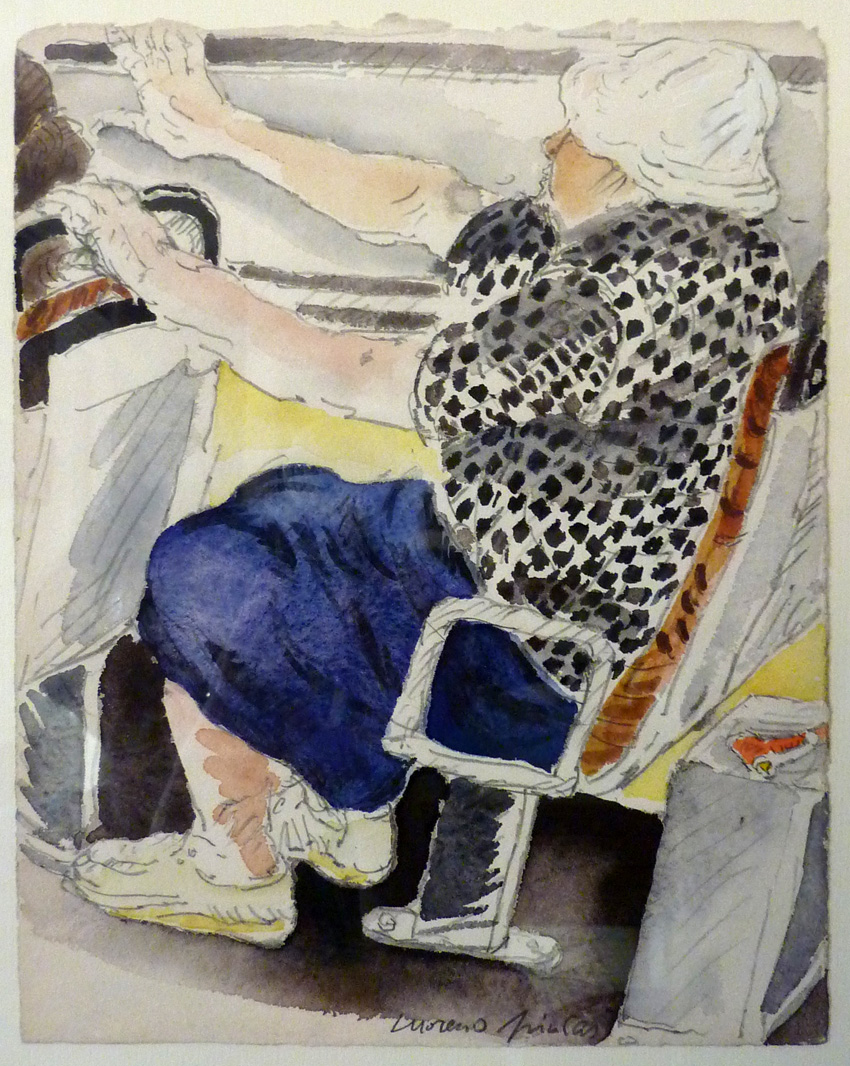 Moreno Pincas, de pilda, are majoritatea picturilor sale in maniera grotesca, incercind sa surprinda personajele sale asa cum sint, fara fard. Dar iata un desen care, pastrind principiul reprezentarii neinfrumsetate a realitatii, comunica caldura, simpatie, pina la identificare. O femeie in virsta in autobuz, inclestata pe scaunul dinainte ca sa-si pastreze echilibrul, poate fi o ruda, o vecina, o bunica, o femeia pe care o cunoastem…